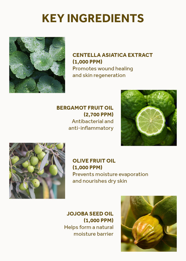 Centella Asiatica Extract, Citrus Aurantium Bergamia (Bergamot) Fruit Oil, Helianthus Annuus (Sunflower) Seed Oil, Olea Europaea (Olive) Fruit Oil, Simmondsia Chinensis (Jojoba) Seed Oil