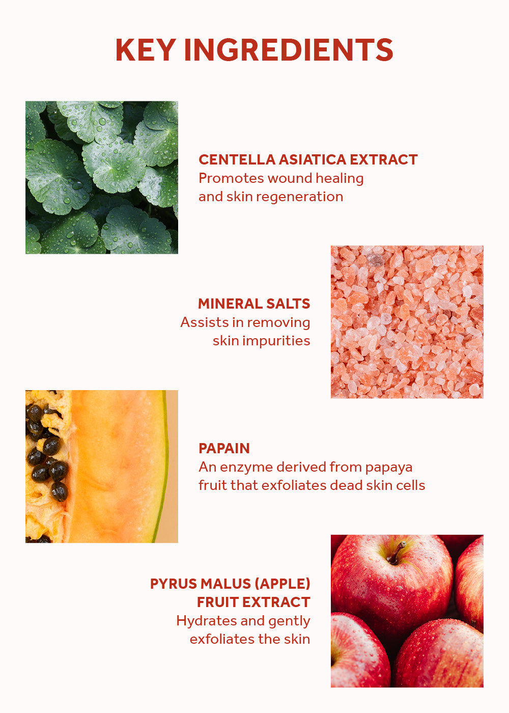 Centella Asiatica Extract, Mineral Salts, Kaolin (CI 77004), Papain, Pyrus Malus (Apple) Fruit Extract
