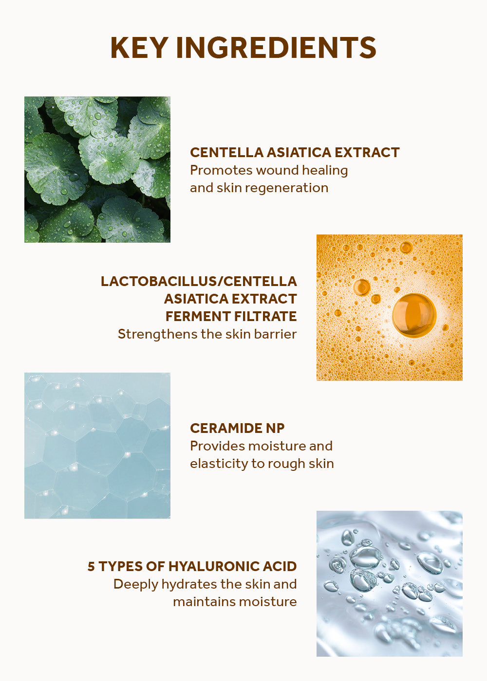 Lactobacillus/Centella Asiatica Extract Ferment Filtrate, Centella Asiatica Extract, Madecassic Acid, Asiaticoside, Asiatic Acid, Hyaluronic Acid