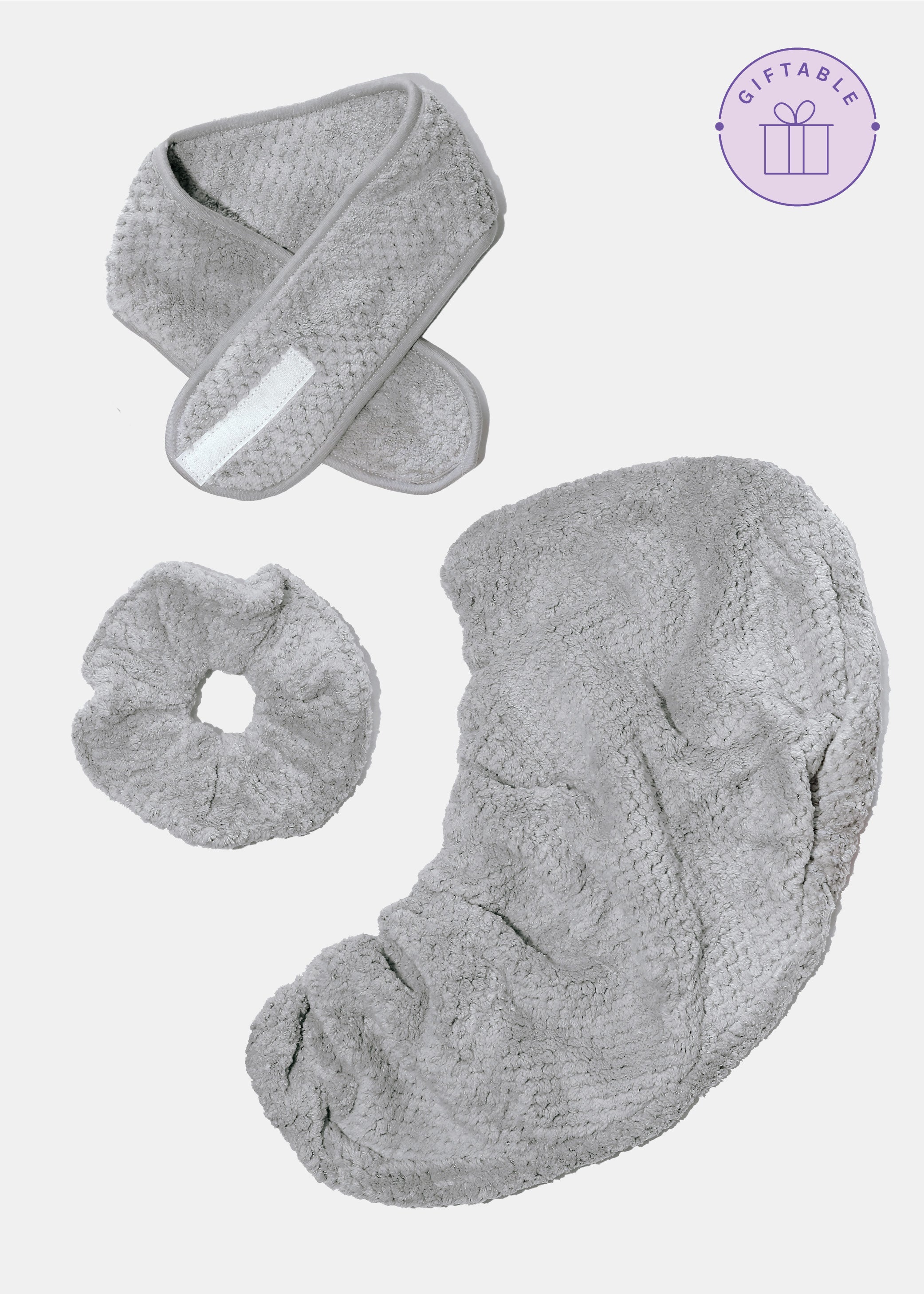 Get all the essentials with this gift-able set that includes 1 Microfiber Hair Turban Towel, 1 Microfiber Spa Headband and 1 Microfiber Towel Scrunchie!