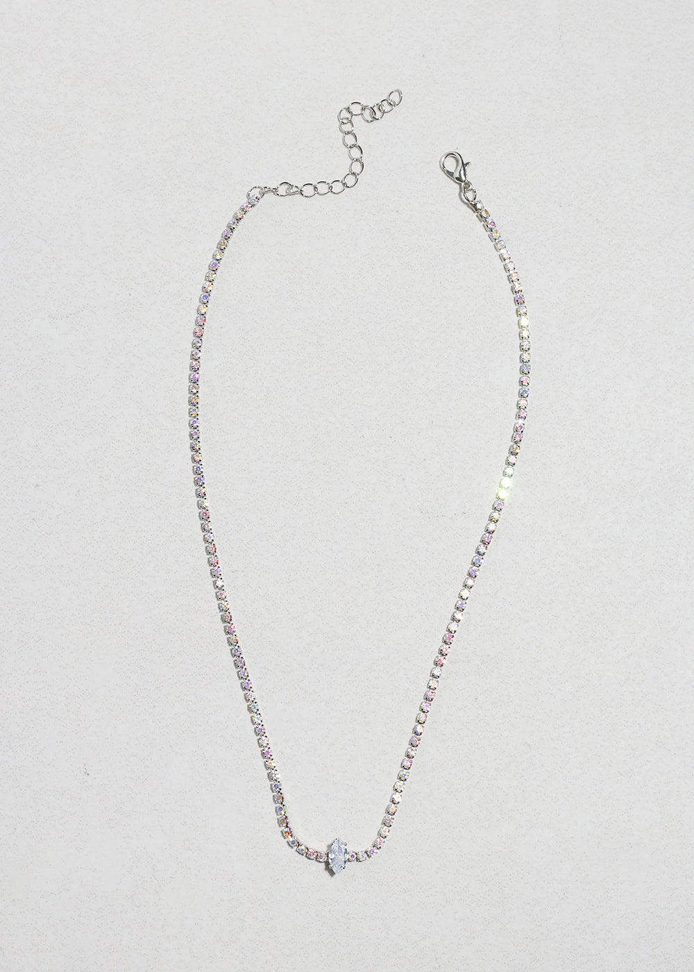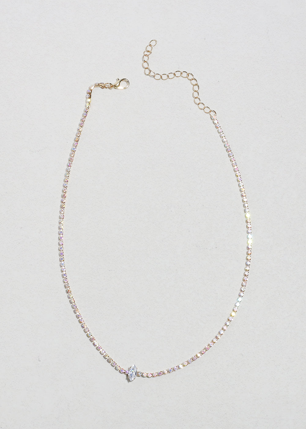 Shine from every angle with our Sparkle Tennis Necklace, the perfect blend of elegance and modern glam. Designed with shimmering multicolor cubic zirconia stones and finished with a dainty marquise cut-like centerpiece, this necklace catches the light beautifully for a radiant, eye-catching look.