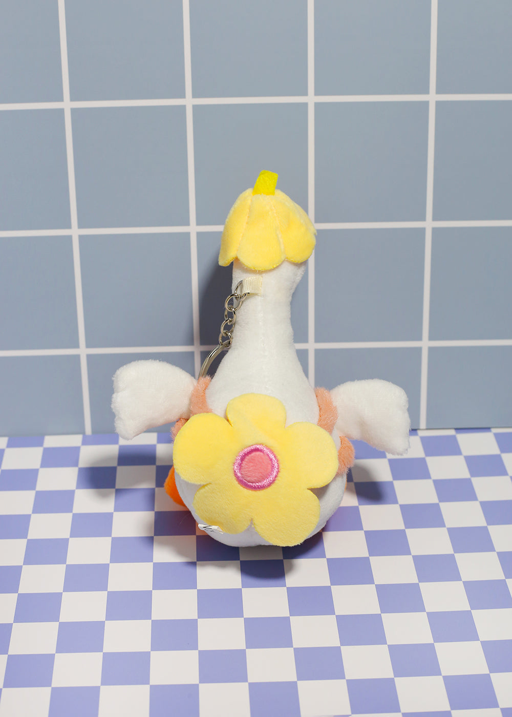 This soft and cuddly goose plush features a cheerful yellow flower detail and bright orange feet, making it the perfect feel-good accessory for your keys, bag, or backpack.