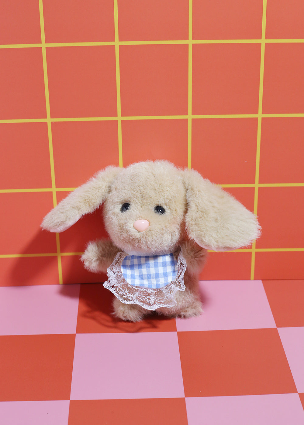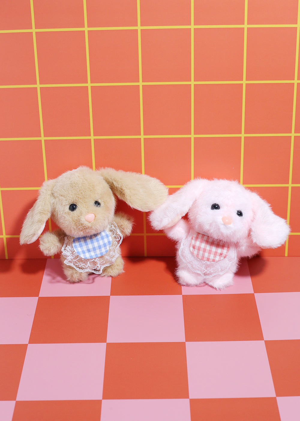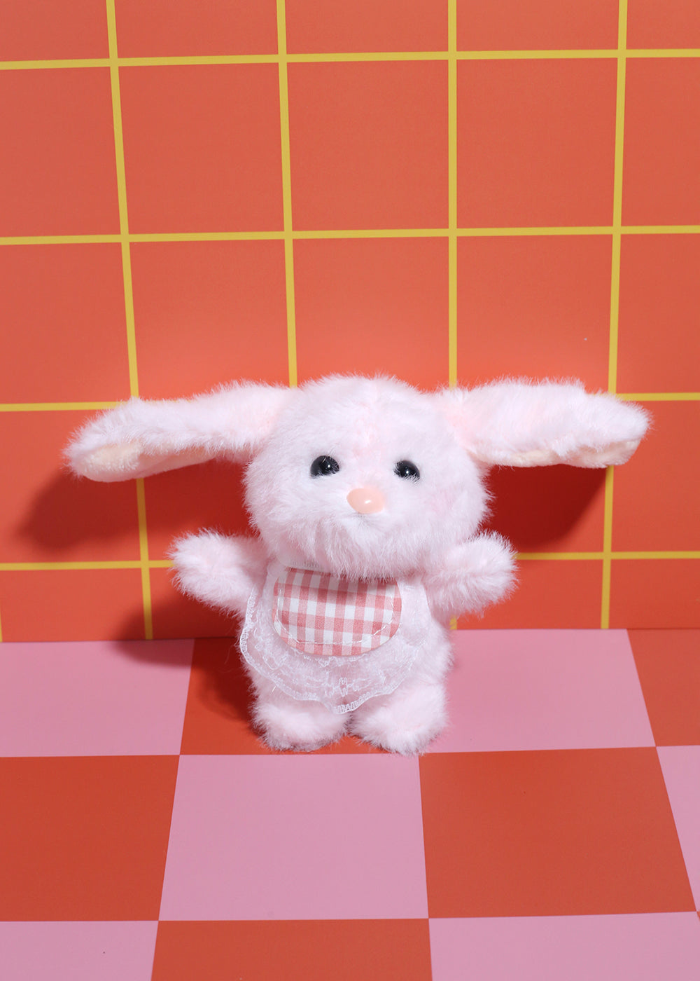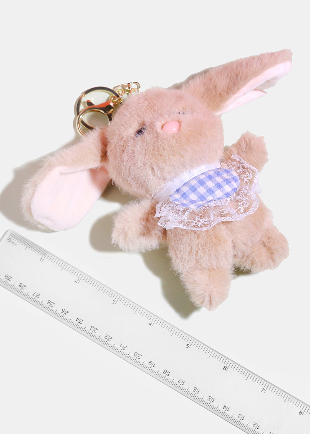 This soft and fluffy bunny plush features long floppy ears and an adorable gingham bib with lace trim, making it the perfect charming accessory for your keys, bag, or backpack.