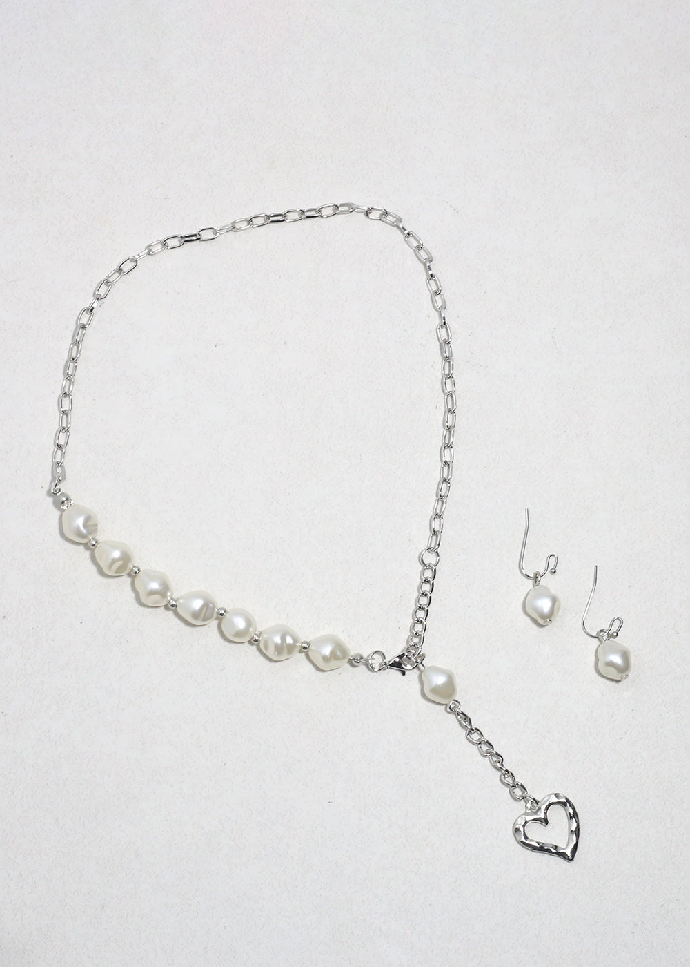 Complete with matching pearl drop earrings, this set is crafted to stand out whether worn alone or layered with your favorite pieces. Choose from gold or silver finishes to suit your personal style.