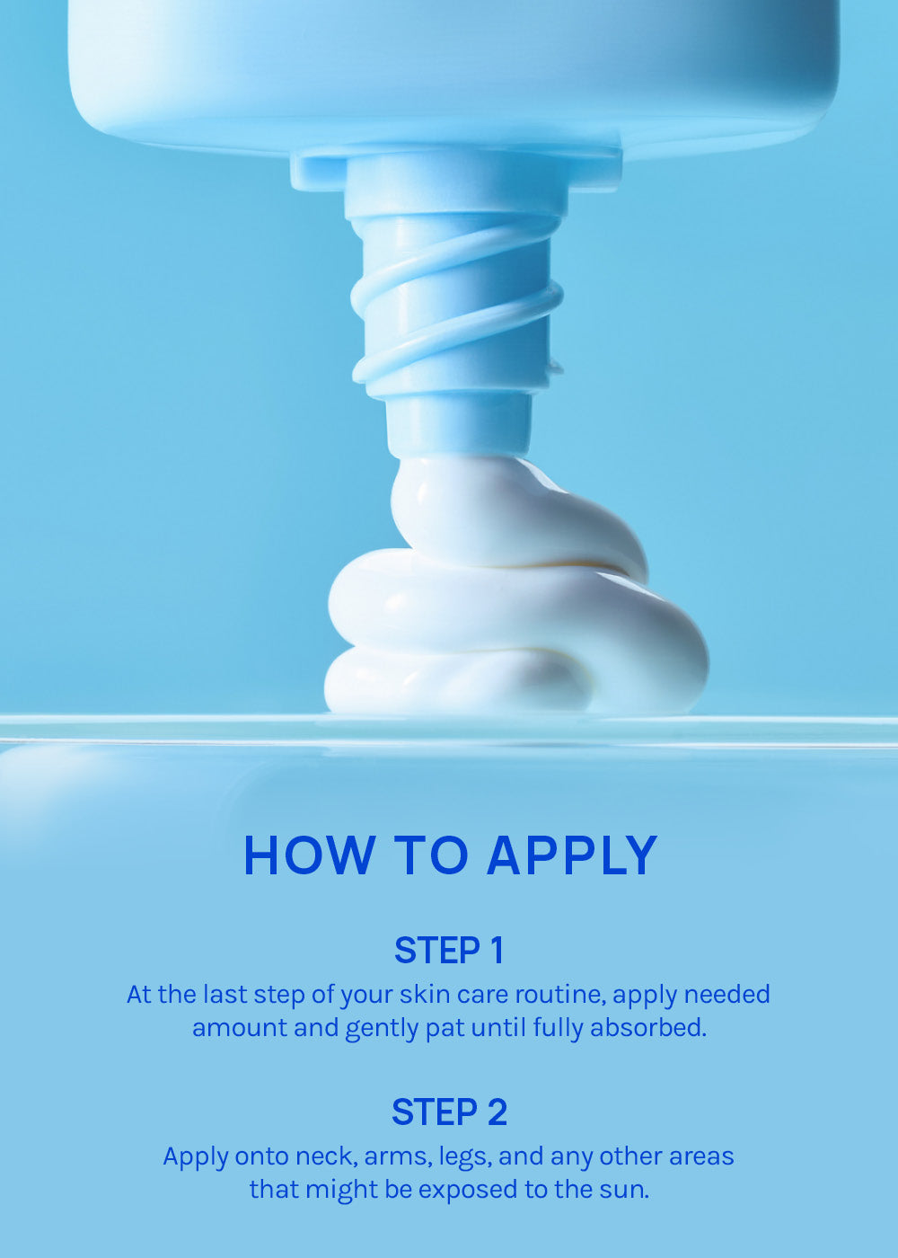 - Apply onto neck, arms, legs, and any other areas that might be exposed to the sun.
