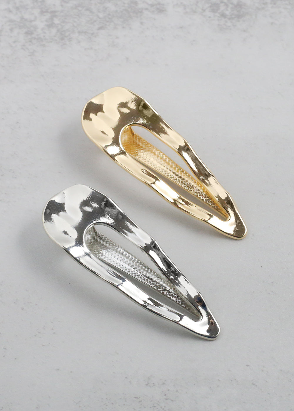 Elevate your hair game with these Wave Metal Hair Clips, the perfect blend of elegance and functionality. Featuring a modern, wavy design with a luxe metallic finish, these snap clips effortlessly hold your hair in place while adding a touch of sophistication. Available in both gold and silver, these versatile clips complement any outfit, making them a must-have for everyday wear or special occasions.